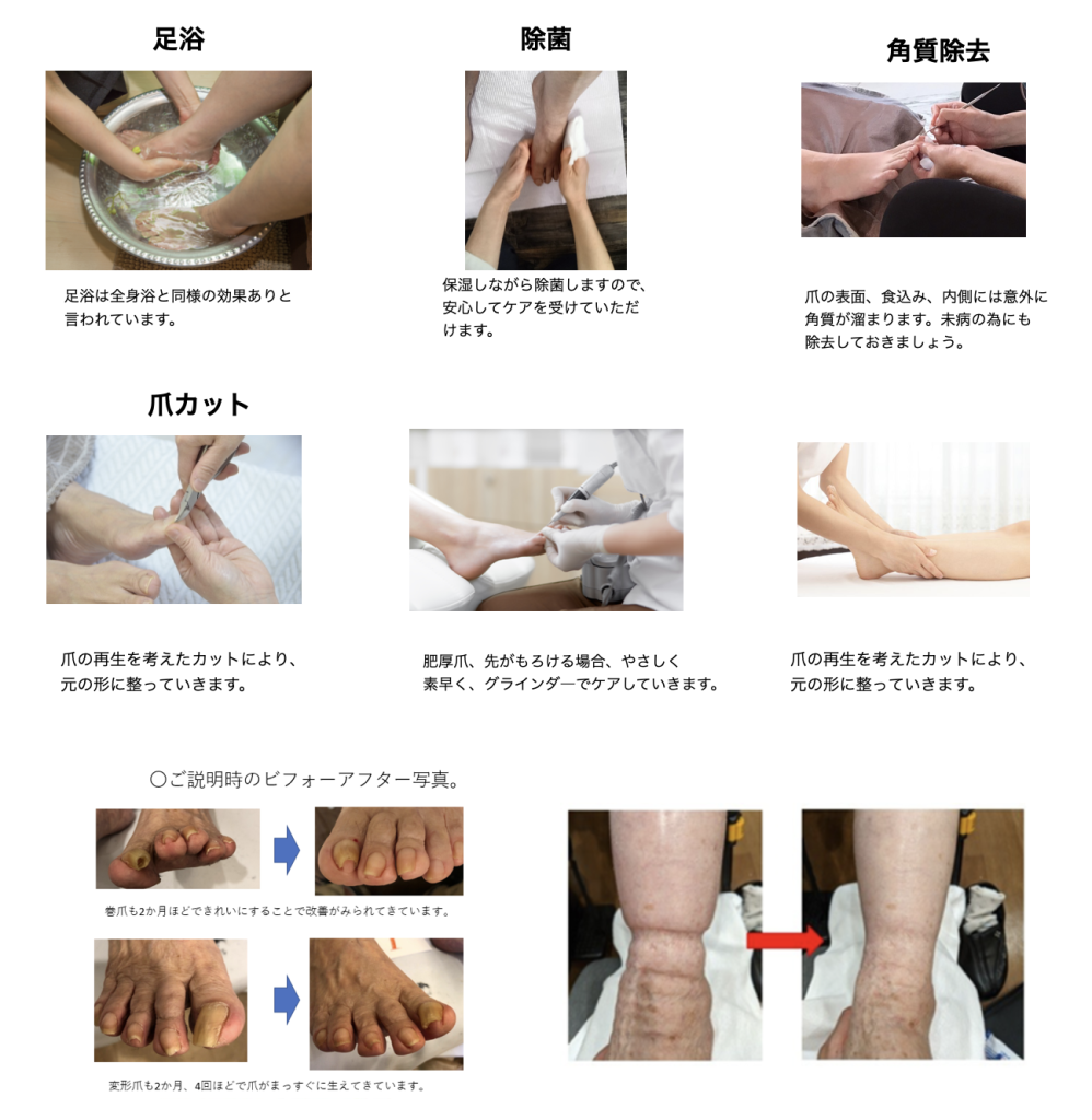 巻き爪、肥厚爪、トラブル爪等でスタッフでは爪切りが出来ない、浮腫みやだるさで悩んでいるご入居者様にこたえたい。等の声からスタートしました。高齢者向けのフットケアがどんなものなのか是非、ご導入前にお試しください!お問い合わせからお申込、ご質問ください。